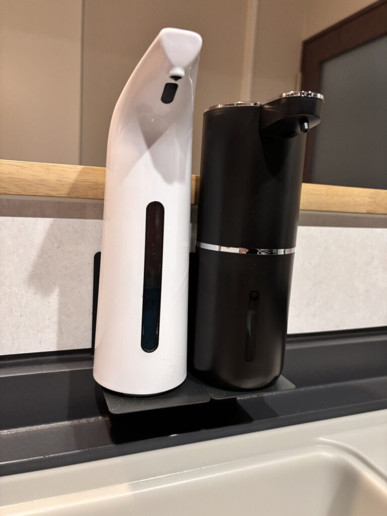 また、私はリノベ前からオートディスペンサーを使用していて、前述しましたがラックにディスペンサーを置いていると何かの作業の際に動作し、手に洗剤を浴びることがありストレスに感じていました。