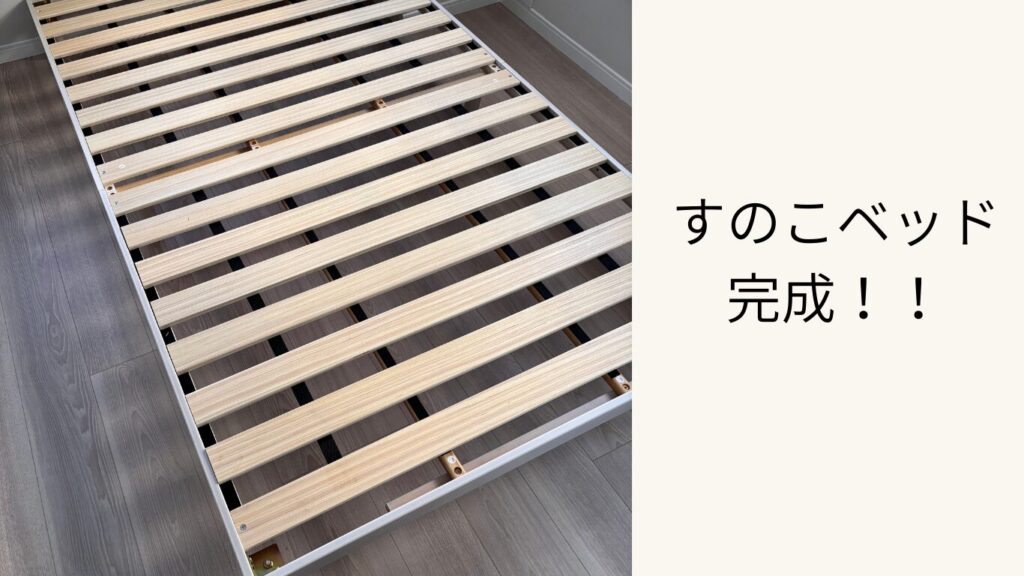 もう一度解体してダボを入れる元気はなく、出来上がったベッドのフレームを手で揺すってみましたが「結構ガッチリしてそう!」ということで「見なかったこと」にしました💦💦
